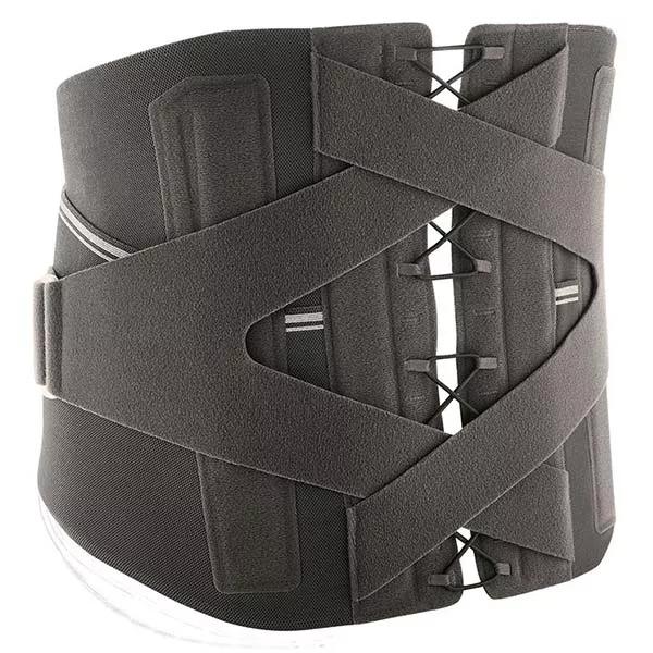 Quatre baleines en métal intégrées adaptables et un système de sangles additionnelles à 3 points contribuent à soutenir et à soulager le rachis lombaire.