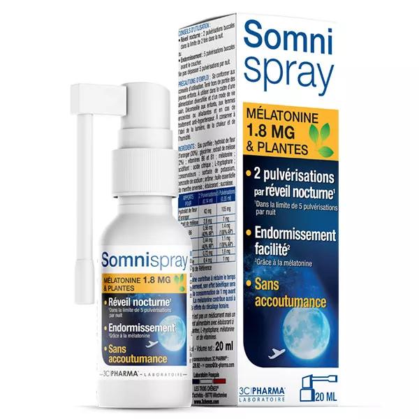 Descrizione ico-chevron-down Somnispray 20ml est un complément alimentaire du laboratoire 3 C Pharma à base d'hydrolat de fleur d'Oranger, d'extrait de Mélisse, de vitamine B6, de vitamine B1, de Mélatonine et de L-tryptophane.