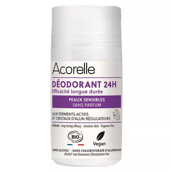 Le Déodorant Roll-on Peaux Sensibles sans parfum Acorelle dispose d’une efficacité 24h prouvée grâce à son complexe d’actifs objectivés à base de Cristaux d’Alun & Ferments Actifs. Formulée sans sels d’aluminium ni alcool, sa formule est aussi respectueuse de la santé qu’elle prend soin de la peau avec ses actifs hydratants et nourrissants. Pour le respect des peaux les plus sensibles et réactives, ce déodorant a été formulé sans parfum.
