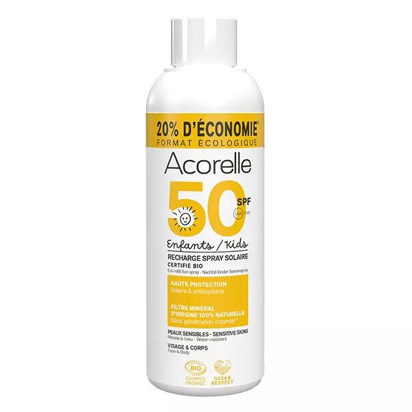 Acorelle Nature Sun Enfants Recharge Spray Solaire Bio SPF50 150ml permet de se réapprovisionner en protection solaire en limitant les déchets et en faisant des économies.Ce soin solaire protège la peau du fortement du soleil et de ses méfaits grâce à son fort indice solaire SPF50. Au filtre minéral, il contient un cocktail d'actifs qui préserve le capital soleil de vos enfants.