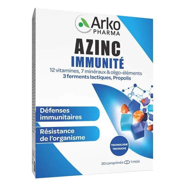 Azinc Immunité est un complément alimentaire du laboratoire Arkopharma à base de vitamines A, B1, B2, B3, B5, B6, B9, B12, C, E, D3, B8, de sélénium, de fer, de zinc, de manganèse, de cuivre, de chrome, de molybdène, d'extrait sec de propolis et de ferments lactiques.