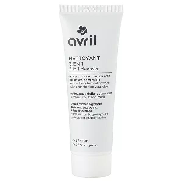 Le Nettoyant 3 en 1 Bio de la marque Avril est enrichi en poudre de charbon actif, en argile blanche et en aloe vera bio, afin d'assainir les peaux mixtes à grasses.