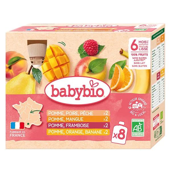 Mela Pera Pesca: Mele dalla Francia* 49,7%, pere dalla Francia* 30%, pesche dall'Occitania* 20%, succo di limone concentrato dalla Spagna* 0,3%. Mela Mango: Mele dalla Francia* 85%, mango dall'India* 15%. Mela Lampone: Mele dalla Francia* 85%, lamponi dalla Spagna* 15%. Mela Arancia Banana: Mele dalla Francia* 71,8%, succo d'arancia dalla Spagna* 14%, banane dall'Ecuador* 14%, succo di limone concentrato dalla Spagna* 0,2%. *Ingredienti da agricoltura biologica