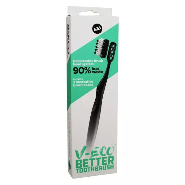 Descrizione ico-chevron-down Avec Better Toothbrush V-Eco Set de Démarrage Noir , vous ne remplacez que la tête au lieu de la brosse à dents entière.