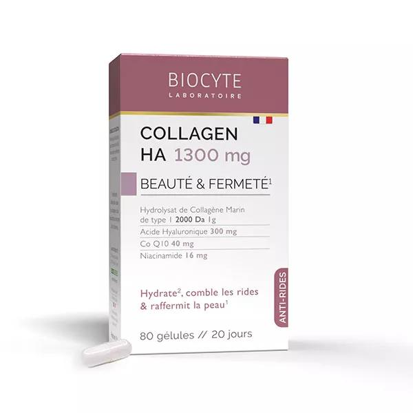 Complément Alimentaire Collagène : Le complément alimentaire Collagen HA 1300 mg de Biocyte vise à réduire la profondeur des rides tout en raffermissant et repulpant la peau. Sa formule, concentrée à base d'hydrolysat de collagène marin, d'acide hyaluronique, de coenzyme Q10 et de niacinamide, offre une action complète.