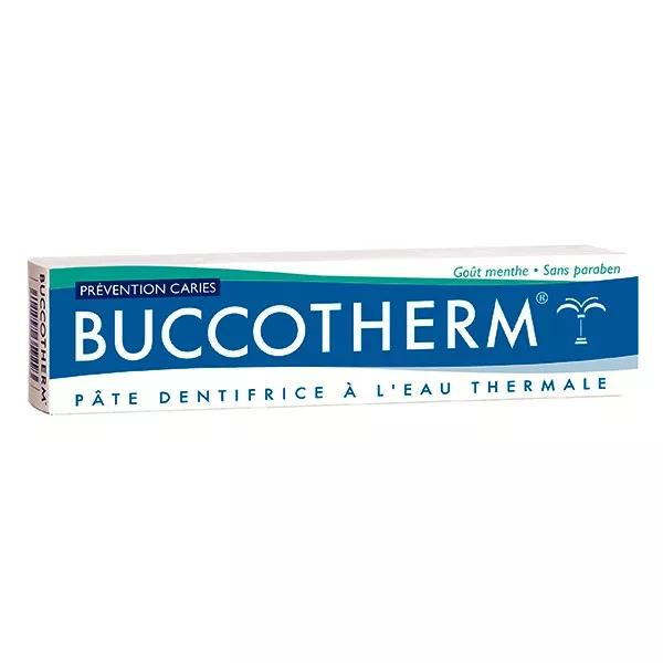 Panoramica : BUCCOTHERM prevenzione carie un dentifricio rinforzato in fluoro e dotato di un pH alcalino che favorisce la rimineralizzazione dei denti e aiuta a combattere contro la formazione della plauque dentali. d suo principio attivo, l'acqua termale di Castra - Verduzan, lenitivo e curativo propriet per prendersi cura del tuo gengive. menta, lascia una sensazione di freschezza che dura. senza alcool senza saccarina senza coloranti o profumi di sintesi. Suggerimenti per l'uso : Nella spazzolatura al giorno dopo ogni pasto, seguita da uno spruzzo di spray dentale BUCCOTHERM.