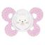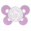 La sucette est dotée d'une tétine active en silicone extra-doux dont le bout est incurvé et comporte des micro nervures qui aident bébé à bien positionner sa langue et ses lèvres. La base de la tétine est fine et étroite pour permettre à bébé de pouvoir bien fermer sa bouche et l'anneau de la sucette la rend pratique à tenir ou à attacher à l'attache sucette.