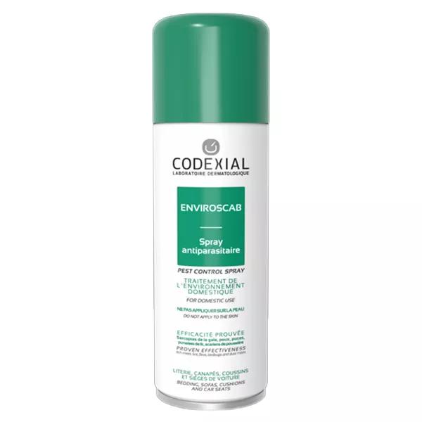 Codexial Enviroscab Spray Antiparasitaire Environnement 200ml est un spray antiparasitaire destiné au traitement de la literie (matelas, oreillers, couvertures, couettes), des canapés, coussins, sièges de voiture ou autre support qui ne peut pas passer en machine à laver (ex : certains vêtements et tissus, chaussures, casques …).