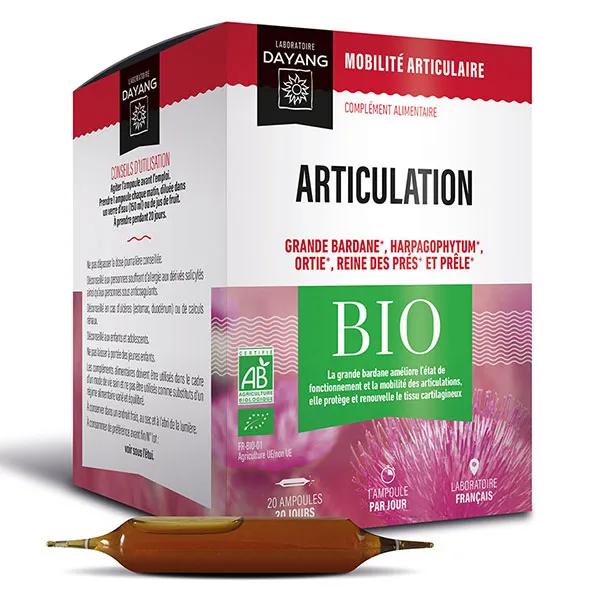 Le laboratoire Dayang vous propose le complément alimentaire Complexe Articulation Bio.Présentée sous forme d'ampoules, sa formule est exclusivement composée de plantes issues de l'agriculture biologique.Dayang a spécifiquement sélectionné des plantes reconnues dans le domaine de la phytothérapie pour les propriétés suivantes :- la Bardane participe à la bonne mobilité des articulations,