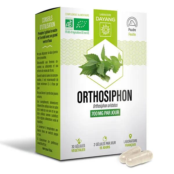 Le produit Orthosiphon BIO DAYANG se présente sous forme d'une poudre qui contient l'ensemble des constituants de la feuille de la plante. Ainsi, 2 gélules de 350 mg correspondent à un apport quotidien de 700 mg de poudre de feuille d'orthosiphon.