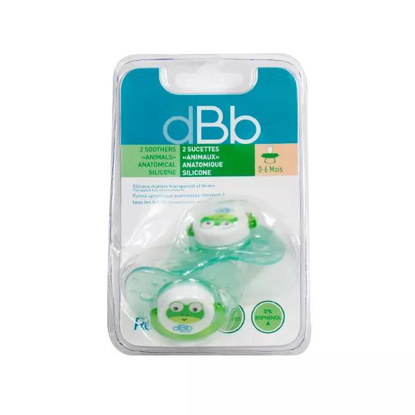 Sucette anatomique Silicone Grenouille Bleu Translucide dBb Remond Lot de 2 ce sont des sucettes en caoutchouc conçues pour les premiers mois de l'enfant, de sa naissance à ses 4 mois.