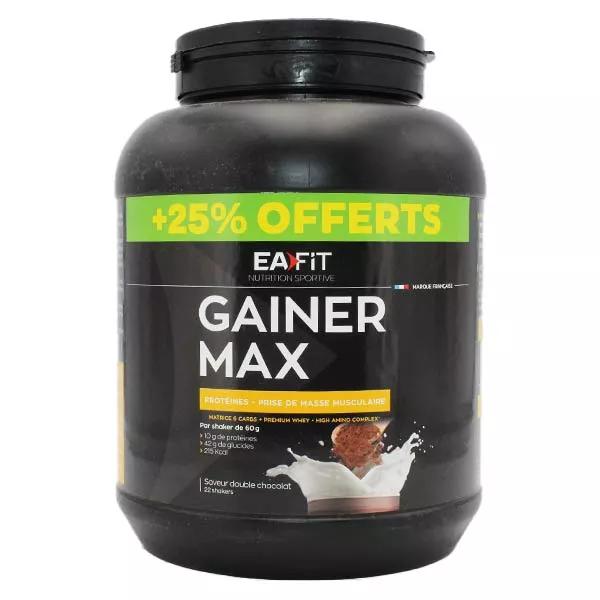 Eafit Gainer Max Double Chocolat 1,1kg est une préparation pour boisson avec apport glucidique sous forme de poudre, spécifiquement formulée pour répondre aux personnes recherchant une prise de masse.