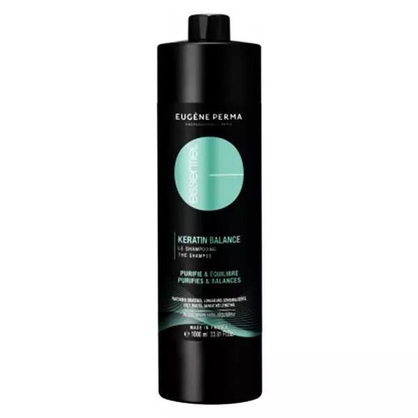 Descrizione ico-chevron-down Le shampooing Essentiel KERATIN BALANCE d'EUGENE PERMA Professionnel rééquilibre les cuirs chevelus à tendance grasse et aux longueurs sèches.