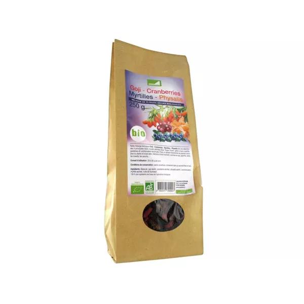 Exopharm Mélange Goji Cranneberies Myrtille Physalis Bio 250g est un mélange de 4 fruits - baies de goji, myrtilles, cranberries et physalis - aussi bons qu'intéressants pour les apports nutritionnels. Idéal pour l'apéritif ou pour agrémenter vos yaourts, ce mélange de fruits convient à un régime vegan et sans gluten.