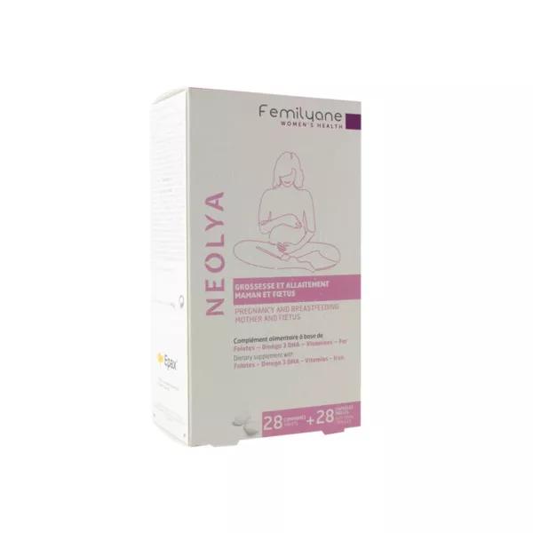 Femilyane Women's Health Neolya est un double complément alimentaire qui peut être pris dès le début de la grossesse jusqu'à l'allaitement.