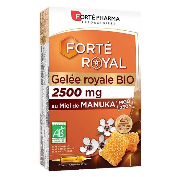 I Laboratori Forté Pharma propongono FORTÉ ROYAL e la sua Pappa Reale Biologica 2500 mg con Miele di MANUKA, un programma di attacco di 10 giorni per prepararsi all'inverno: 2500 mg di pappa reale biologica combinata con Miele di Manuka biologico e miele millefiori biologico. Pappa reale biologica: la pappa reale è un concentrato nutriente naturale, studiato per nutrire la regina, donandole un'incredibile longevità.