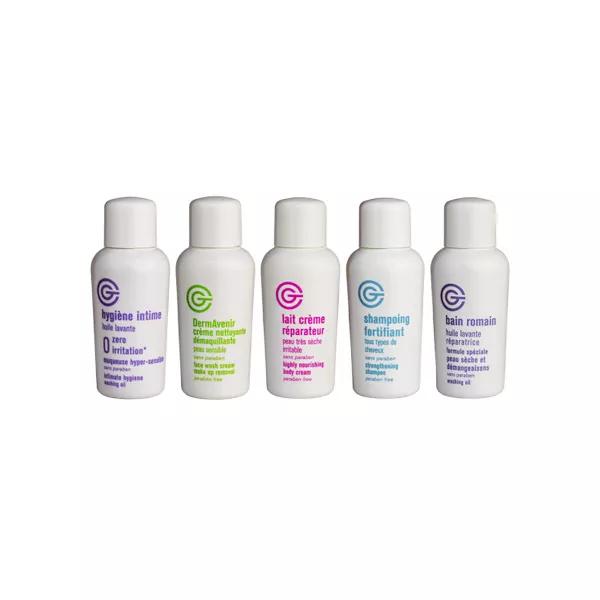 DermAvenir crème nettoyante et démaquillante : Aqua (water), cetearyl alcohol, cetearyl glucoside, sucrose cocoate & alcohol, stearic acid, palmitic acid, decyl oleate, castor (ricinus communis) seed oil, glycerin, olea europaea (olive) fruit oil, gluconolactone, cetyl alcohol, olus oil & hydrogenated vegetable oil & candelilla cera, xanthan gum, sodium dehydroacetate, carrageenan, sodium benzoate, parfum (fragrance), tocopheryl acetate, sodium hydroxide.Le lait crème réparateur : Aqua (water), decyl oleate, octyldodecanol, glycerin, polyglyceryl 2 dipolyhydroxystearate, cera alba (beeswax), urea, olea europaea (olive) fruit oil, polyglyceryl 3 diisostearate, gluconolactone, butyrospermum parkii (shea butter), cetyl alcohol, magnesium sulfate, zea mays starch, parfum (fragrance), sodium benzoate, zinc stearate, tocopheryl acetate, bisabolol, tocopherol, glycine soja oil, aloe barbadensis leaf juice, calcium gluconate, farnesol.Le shampooing fortifiant : Aqua (water), sodium lauryl glucose carboxylate and lauryl glucoside, ammonium lauryl sulfate, cocamidopropyl bétaine, decyl glucoside, hydrolyzed wheat protein, urea, gluconolactone, parfum (fragrance), cocodimonium hydroxypropyl hydrolyzed wheat protein, sodium dehydroacetate, sodium benzoate, polyquaternium 10, glycerin, gum xanthaneLe bain romain : Mipa-laureth sulfate, laureth 4, cocamide dea, paraffinum liquidum (mineral oil), aqua (water), sodium lauryl carboxylate, lauryl glucoside, peg 6 caprylic/capric glycerides, decyl glucoside, olea europaea (olive oil) fruit oil, hypericum perforatum extract, tocopherol, glycerin, parfum (fragrance), hydrolyzed wheat protein, urea, gluconolactone, sodium benzoate, aloe barbadensis leaf juice, calcium gluconate, sorbic acid.