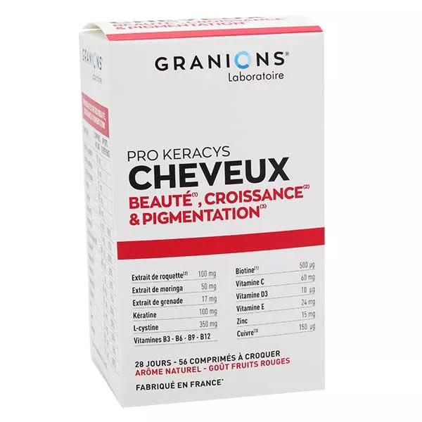 Descrizione ico-chevron-down Pro Keracys Cheveux Beauté & Croissance 56 comprimés à croquer est un complément alimentaire du laboratoire Granions à base de Roquette, Moringa, Grenade et Kératine.