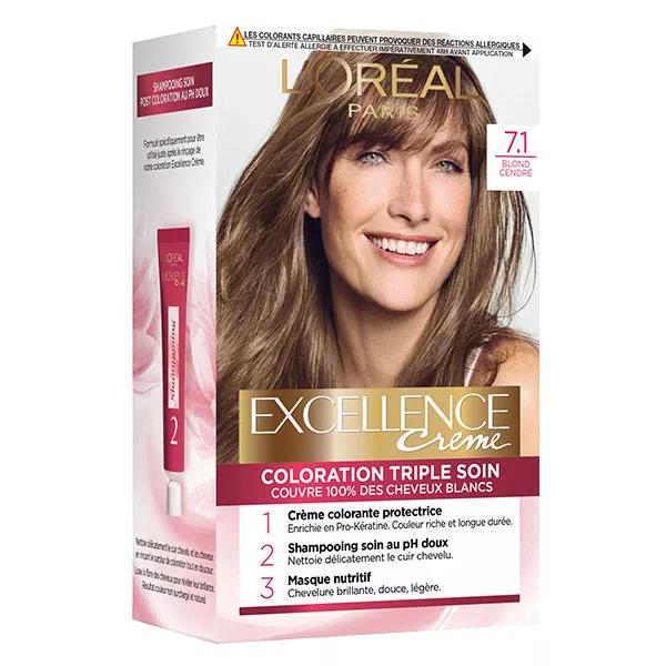 L'Oréal Excellence Crème Coloration Blond Cendré 7.1 Un blond lumineux aux reflets cendrés qui convient aux cheveux blond très clair à châtain clair.