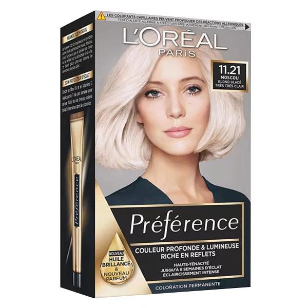 L'Oréal Préférence Coloration Moscou 11.21 Moscou est une nuance blond très très clair aux reflets perlés. Elle convient parfaitement aux teints clairs en leur apportant luminosité et éclat. Nuance adaptée aux cheveux blonds.