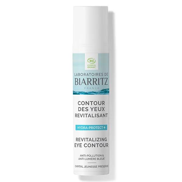 Concentré multi-actions, le soin Contour des yeux revitalisant certifié bio des Laboratoires de Biarritz procure une action ciblée sur les cernes, les poches et les ridules pour un regard frais et éclatant ! Grâce à l'association unique d'actifs hydratants et d'un extrait breveté d'algue rouge issue de la côte basque, Alga-Gorria®, qui protège contre le vieillissement cutané, ce soin contour des yeux Hydra-protect+ répond aux besoins fondamentaux de la peau en lui apportant une hydratation intense et une protection contre les agressions du quotidien (lumière bleue, pollution, stress, fatigue...). Avec une hydratation boostée pendant 24 heures, le regard est reposé. Le contour des yeux est tonifié, raffermi et apaisé ! Sa texture gel-crème à l'effet frais et léger et sans parfum, pour une utilisation en toute sécurité sur la zone délicate du contour de l'oeil. Formulé pour tous les types de peau, comme tous les autres soins de la gamme Hydra-protect+, il convient également pour une utilisation chez la femme enceinte et allaitante.Indications