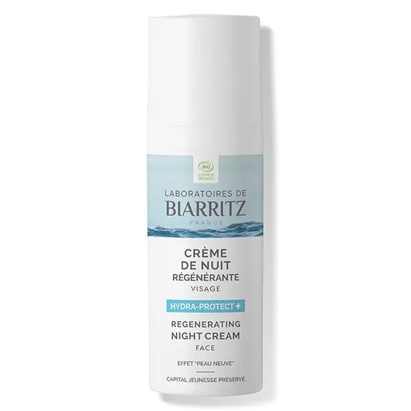 Grâce à l'association unique d'actifs hydratants et d'un extrait breveté d'algue rouge issue de la côte basque, Alga-Gorria®, qui protège contre le vieillissement cutané, la Crème de nuit régénérante certifiée bio des Laboratoires de Biarritz répond aux besoins fondamentaux de la peau en lui apportant une hydratation intense et une protection contre les agressions du quotidien (lumière bleue, pollution, stress, fatigue...). La Crème de nuit Hydra-protect+ booste l'hydratation pendant 24 heures. La peau apparaît plus jeune et plus lisse : elle est comme régénérée, plus confortable et plus souple, effet "peau neuve" assuré ! Les traits du visage sont "défatigués", reposés et détendus. Sa texture douce et enveloppante apporte hydratation et confort à la peau du visage et du cou. Son parfum naturel, léger et délicat procure un réel instant de détente. Formulée pour tous les types de peau, comme tous les autres soins de la gamme Hydra-protect+, elle convient également pour une utilisation chez la femme enceinte et allaitante.Indications
