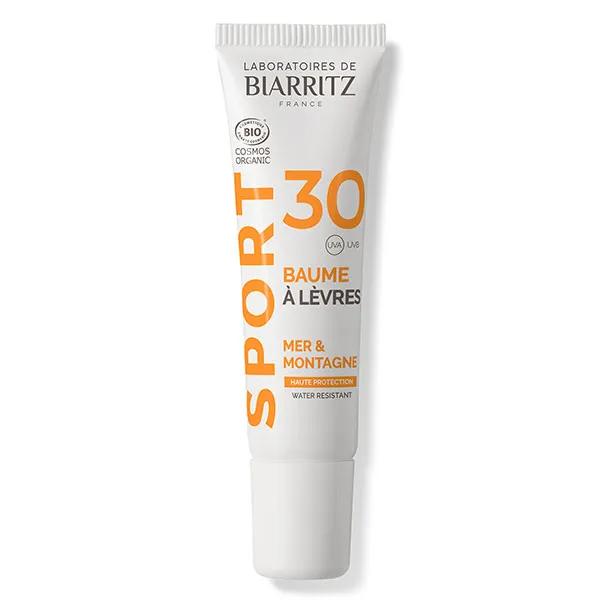 Le Baume à lèvres sport SPF30 certifié bio des Laboratoires de Biarritz est conçu pour protéger les lèvres des agressions extérieures dans les situations extrêmes, à la mer comme à la montagne, lors de la pratique sportive. Il résiste fortement au vent et à l'eau pour offrir une protection sans faille. Idéal pour les sportifs, ce baume à lèvres assure une protection optimale, technique et longue durée ! Son format compact se glisse facilement dans la poche. Comme tous les autres soins solaires de la marque, sa formule contient Alga-Gorria®, un extrait breveté d'algue rouge (Gelidium sesquipedale) issue de la côte basque. La performance de ce baume à lèvres réside d'ailleurs dans sa formule ultra-technique développée en collaboration avec des partenaires sportifs : il protège des UV tout en formant un cocon protecteur longue durée. Les lèvres sont protégées du dessèchement et des agressions extérieures ; elles retrouvent confort et souplesse. Sans parfum, il respecte la peau sensible des lèvres et peut être utilisé dès 3 ans.Indications