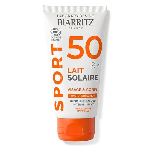 Le Lait solaire sport SPF50 certifié bio des Laboratoires de Biarritz assure une haute protection naturelle et garde la peau du visage et du corps hydratée tout au long de l'exposition au soleil. L'action combinée de ses écrans minéraux anti-UVA/UVB et de son extrait breveté Alga-Gorria®, issu de l'algue rouge de la côte basque, prévient les dommages cellulaires et le vieillissement cutané. Sa formule a été étudiée et pensée pour les sportifs : sa résistance à l'eau et à la transpiration a été testée et approuvée par des athlètes de haut niveau durant leurs efforts les plus intenses. Son format nomade pratique vous suivra dans toutes vos activités outdoor, à la mer comme à la montagne ! Enrichi en beurre de karité et huile de noix de coco bio, le Lait solaire sport SPF50 nourrit, protège et apporte confort à la peau. Sa texture est onctueuse, facile à étaler pour une utilisation sur le visage et le corps. Sans parfum, le lait solaire SPF50 convient aux peaux claires, et est idéal pour toutes les peaux fragiles ou sensibles au soleil.
