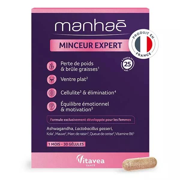 Manhaé Minceur Expert est un complément alimentaire minceur dont la composition naturelle et complète comprend plusieurs ingrédients clés. Il contient de la noix de kola, du Lactobacillus gasseri et de la fleur de mauve, qui favorisent la perte de poids, un ventre plat et limitent les ballonnements. Le marc de raisin, quant à lui, agit comme un draineur naturel et aide à réduire la cellulite. La queue de cerise contribue au fonctionnement normal de l'élimination de l'organisme. Enfin, l'association de vitamine B6 et d'ashwagandha soutient la motivation pendant le processus de perte de poids. Cette combinaison d'ingrédients vise à offrir un soutien complet pour atteindre les objectifs minceur.