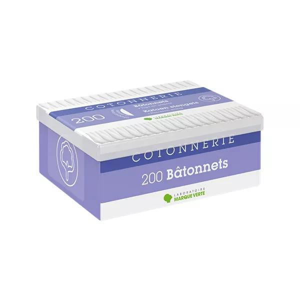 Les Bâtonnets de coton Marque Verte font partie des indispensables de votre salle de bain. Ils permettent de nettoyer les orifices auriculaires et d'éliminer le cérumen, ce liquide jaune disgracieux, qui s'écoule naturellement.Les utiliser régulièrement, c'est éviter l'agglutination de cérumen dans votre oreille et éviter les bouchons, qui peuvent être la cause d'une baisse de l'audition et de troubles de l'équilibre.Sa tige est en plastique souple et chaque extrémité est recouverte d’un embout 100% coton fixé à chaud sur la tige aux extrémités crantées (thermosoudage assurant une fixation parfaite des embouts sur la tige).Ces bâtonnets peuvent également servir pour l’application de soin localisé, pour le maquillage, etc.Indications