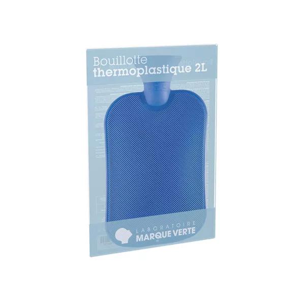 Marque Verte Bouillote Thermoplastique 2L est un récipient plat de forme rectangulaire aux angles arrondis, avec 1 face à relief lamellé en oblique, d'une capacité de 2 litres fermé par un bouchon à vis placé au fond du large goulot de remplissage.
