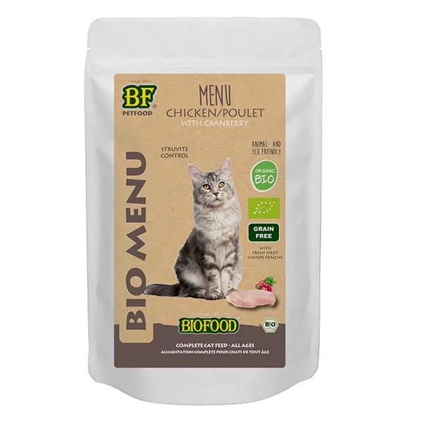 Menù biologico Biofood per gatti a base di carne di pollo biologica al 79%. Confezione da 100 g.