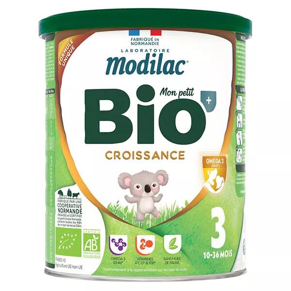 AVIS IMPORTANT: Le lait maternel est l’aliment idéal du nourrisson. Modilac Mon Petit Bio Croissance + peut le compléter ou le remplacer si vous ne l’allaitez pas. Modilac Mon Petit Bio Croissance + répond aux besoins du nourrisson jusqu’à 36 mois. Suivez les conseils de votre médecin pour l’utilisation d’un lait infantile et pour l’alimentation de votre bébé.
