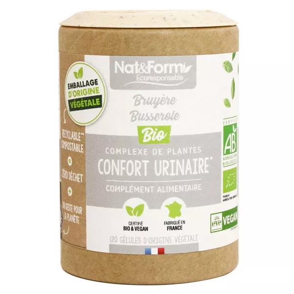 Eco Responsable Complexe Confort Urinaire Bio 120 gélules est un complément alimentaire du laboratoire Nat & Form à base de poudre de sommités fleuries de Bruyère et de poudre de feuilles de Busserole, poudres issues de l'Agriculture Biologique.
