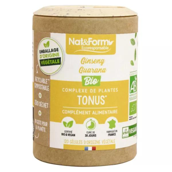 Eco Responsable Complexe Tonus Bio 120 gélules est un complément alimentaire du laboratoire Nat & Form à base de poudre de graines de Guarana et de poudre de racines de Ginseng, poudres issues de l'Agriculture Biologique.