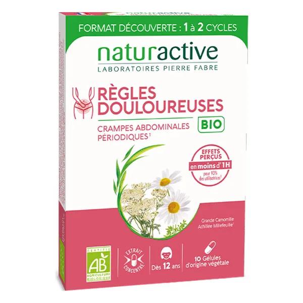 Naturactive Règles Douloureuses BIO est une formule aux actifs 100% d'origine végétale et bio contribue à apaiser rapidement les règles douloureuses, avec des effets perçus en moins d'une heure pour 93% des utilisatrices*. La Grande Camomille et l'Achillée Millefeuille sont les plantes sélectionnées pour leur action sur le confort menstruel et les crampes abdominales.