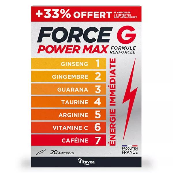 Force G Power Max offre une solution complète et renforcée pour dynamiser votre organisme et combattre efficacement la fatigue passagère. Cette formule unique associe sept actifs puissants : le ginseng, le gingembre, le guarana, la taurine, l'arginine, la vitamine C et la caféine, pour une réponse immédiate à la fatigue.