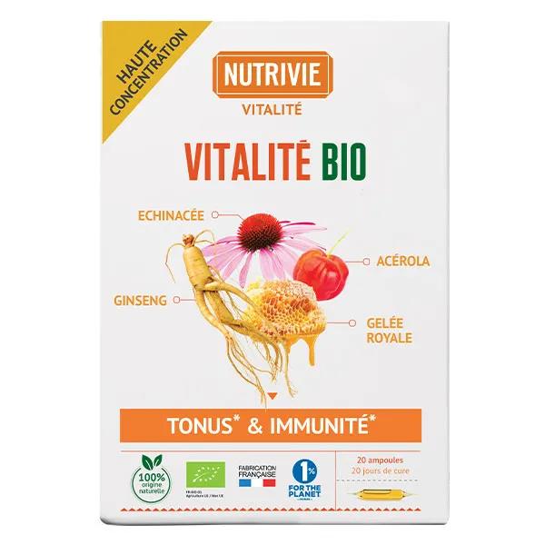 Nutrivie Complexe Vitalité Bio 20 ampoules est un complément alimentaire formulé à base gelée royale, d'acérola, d'échinacée, de ginseng et de vitamine C.