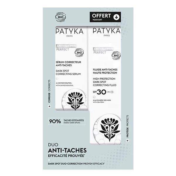Patyka Duo Anti-Taches 80mlVéritable protocole expert certifié bio, les soins ANTI-TACHES PERFECT sont hautement concentrés en actifs éclaircissants naturels pour venir à bout des taches et retrouver un teint unifié et éclatant.Ce coffret propose un protocole ciblé anti-taches contenant :- Le Sérum Correcteur Anti-Taches - 30ml : soin d'attaque ultra-concentré en Oxyresveratrol et Fougère des Mers, actifs éclaircissants naturels à l'efficacité démontrée, il corrige progressivement tous les types de taches pigmentaires pour un teint uniforme et plus lumineux.