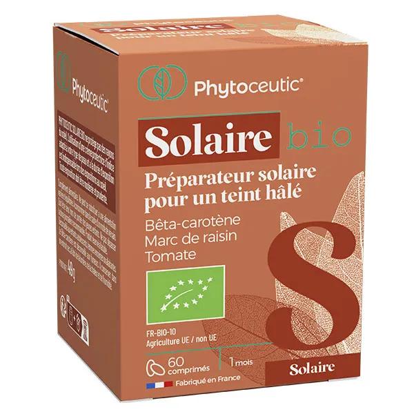 Les comprimés solaires bio de Phytoceutic sont des compléments alimentaires d'origine naturelle offrant un hâle naturel toute l'année.Formulés à base de dunaliella salina (algue naturellement riche en bêta-carotène), d'extraits de carotte, de raisin et de tomate, ansi que de vitamine E antioxydante, ces comprimés solaires bio permettent d'hydrater la peau, de renforcer le hâle naturel, de préparer à l'exposition solaire et de lutter contre les radicaux libres responsables du vieillissement cutané.