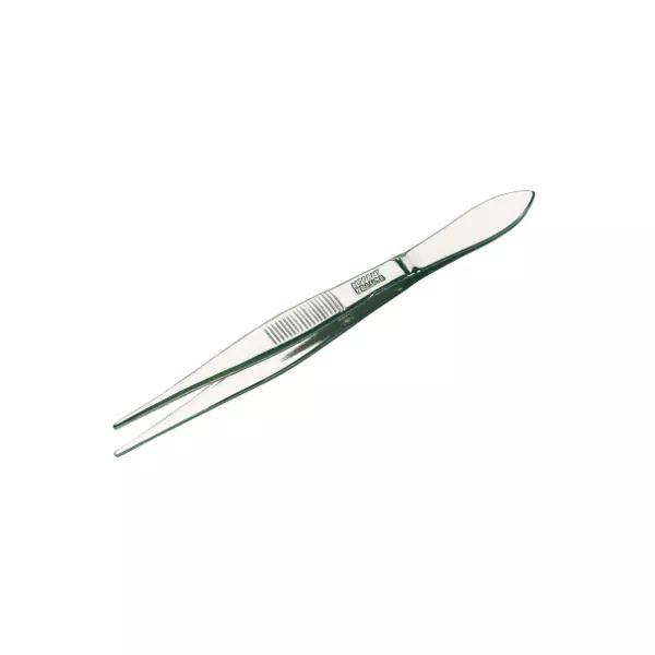 Pince formée de 2 branches métalliques lisses, terminées en pointe très effilée; ces extrémités s'accolent quand on appuie sur les branches, pour saisir l'élément étranger.