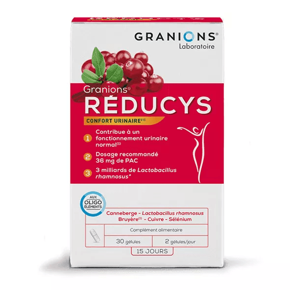 Granions Reducys Composizione: Reducys si compone di PAC (proantocianidine) di mirtillo per limitare l'insediamento dei batteri (compresi Escherichia Coli) responsabili per lo sviluppo di cistite e geni urinarie . i probiotici (Lactobacillus Rhamnosus) ripristino e mantengono l'equilibrio della flora vaginale, Heather ha un'azione purificante e disintossicante virt; tracce di minerali, tra cui rame e selenio, stimolare il sistema immunitario e partecipare alla protezione del corpo per ridurre le recidive.