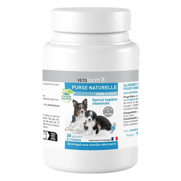 Alimento complementare per cani e cuccioli con estratti di aglio, timo e semi di zucca. Realizzato con ingredienti naturali al 100%, Vétoform Natural Purges contiene lievito di birra e tre estratti vegetali (aglio, timo e semi di zucca), tradizionalmente utilizzati per favorire una migliore igiene intestinale del vostro animale domestico.