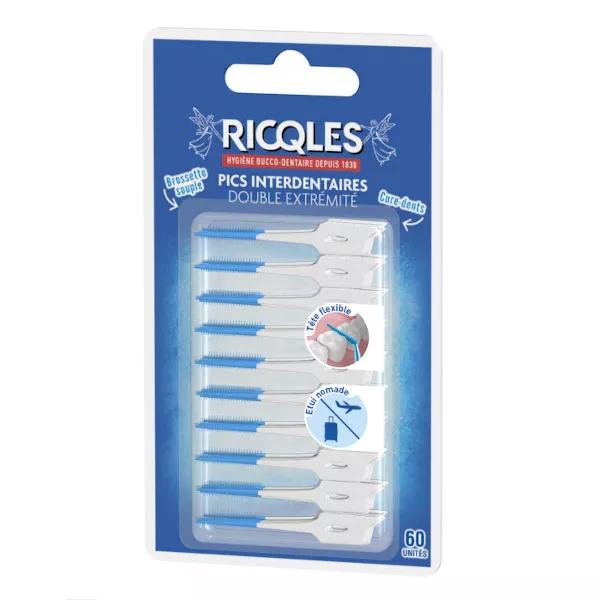 Ricqles Pics Interdentaires Double Extrémité 60 unités sont dotés de deux embouts : l'un en forme de cure-dent et l'autre de brossette souple.