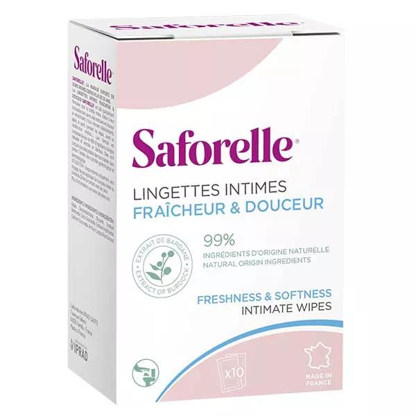 Saforelle Soin & Hygiène Lingettes Intimes Biodégradables Individuelles 10 sachets sont des lingettes intimes hydratantes, douces et apaisantes qui nettoient en douceur et rafraîchissent à tout moment de la journée (déplacements, après le sport, pendant les règles, avant un rendez-vous médical…).