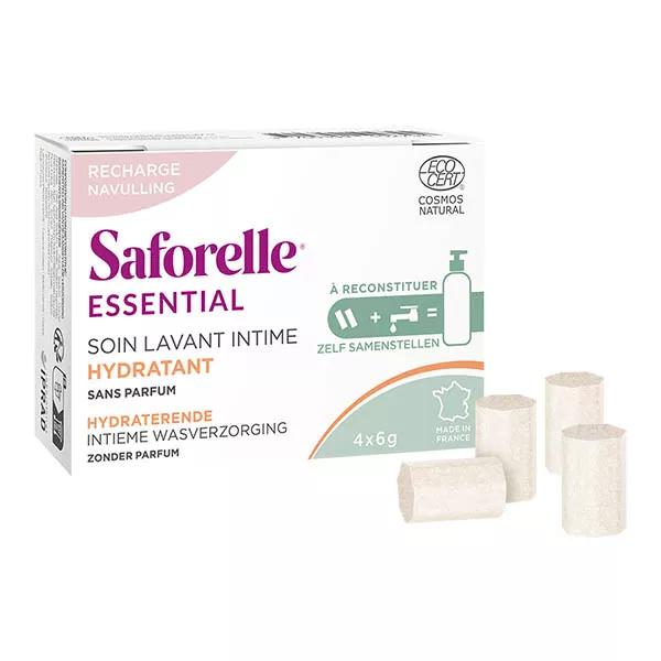 Contenu : 4 bâtonnets secs permettant de reconstituer 400 ml de soin, soit 2 flacons de 200 ml de soin chacun. SAFORELLE ESSENTIAL EST LA PREMIÈRE GAMME DE SOINS LAVANT INTIMES ÉCOCONÇUS : Un produit sans eau à reconstituer chez soi pour limiter le transport d’eau. Un flacon en aluminium recyclé à réutiliser pour limiter les déchets. 99% d’ingrédients d’origine naturelle* (*sur le soin lavant reconstitué), à l’extrait de Bardane biologique et enrichi en extrait d’Opuntia, un prébiotique d’origine naturelle Ce SOIN LAVANT INTIME À RECONSTITUER a été conçu pour la toilette intime et corporelle des peaux normales à sèches. Sa formule, à l'extrait de Bardane biologique et enrichie en extrait d'Opuntia, un prébiotique d’origine naturelle, apaise les sensations de tiraillements et hydrate (+22% 2 heures après application*) tout en respectant et préservant l’équilibre de la flore intime. Grâce à sa formulation douce, sans savon et sans parfum, ce soin protège la zone intime au quotidien. Testé sous contrôle dermatologique et gynécologique.*Évaluation biométrologique de l'effet de perte d'eau transépidermique et de l'effet hydratant, 11 femmes volontaires, âgées de 18 à 65 ans, EUROFINS, Ref. 23E3775, 11/23.