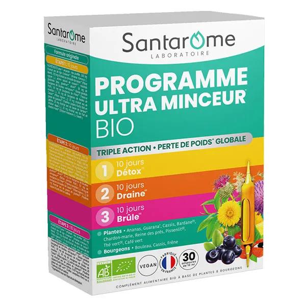 La Santarome Bio Programma Ultra Snellente 30 fialette, è un integratore alimentare che agisce efficacemente grazie alle sue 3 azioni, la sua formmula 100% naturale e bio, è composto da piante conosciute per i loro effetti. Troviamo guaranà, casis, ananas, cenere, frassino, ribes nero e gemme di betulla, bardana o tè verde.