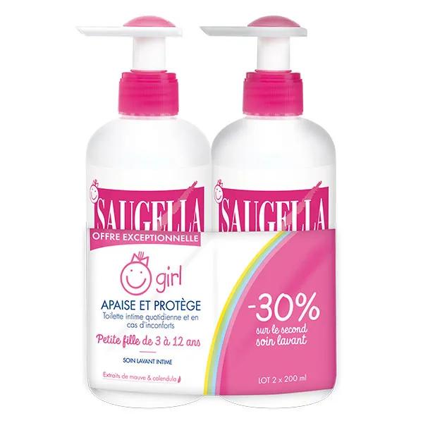 Saugella Girl Soin Lavant Intime Lot de 2 x 200ml contient des extraits de mauve et de calendula, du Lait d’Avoine et des Protéines de Riz.
