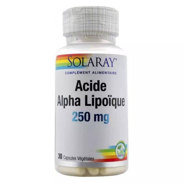 Descrizione ico-chevron-down Solaray Acide Alpha Lipoïque 250mg 30 gélules est un complément alimentaire formulé à base de la molécule acide alpha lipoïque .