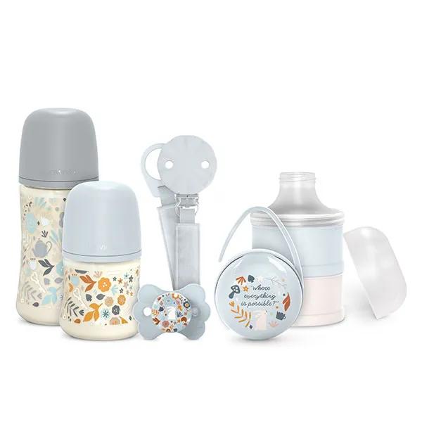 Biberon da 150 ml con tettarella fisiologica in silicone SX Pro, flusso lento (+0 mesi), ideale per i primi giorni di vita del neonato. Questa tettarella è dotata di sistema anticolica. Biberon da 270 ml con tettarella fisiologica in silicone SX Pro, flusso medio (+3 mesi), ideale per succhi di frutta, latte o acqua. Questa tettarella è dotata di sistema anticolica. Ciuccio 0-6 mesi con tettarella fisiologica in silicone SX Pro, ideale per neonati. Clip portaciuccio in tessuto. Per agganciare il ciuccio ai vestitini del bambino ed evitare che cada, si sporchi o si perda. Portaciuccio doppio con 2 scomparti individuali per riporre due ciucci. Smontabile per utilizzare i due scomparti separatamente. Distributore di latte in polvere e cereali lavabile in lavastoviglie con scomparti separati.